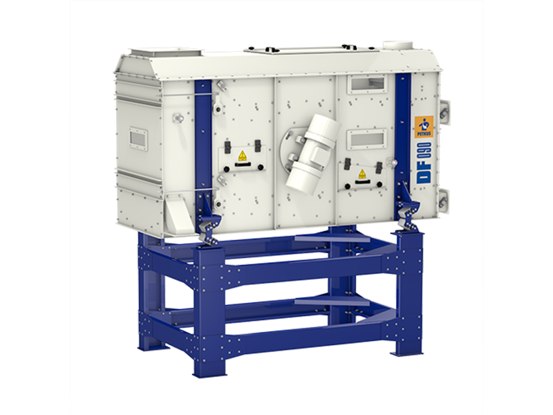The compact PETKUS DF dryers dry product as it flows over zig-zagged levels, based on the vibrating fluidized bed principle. Counterbalance motors create a consistent and uniform vibration, while the air ensures a homogenous flow of goods. Warm air is blown in through two separate and adjustable flaps by a fan located at the side of the dryer and flows through the product in an upward motion. Four temperature sensors allow for optimal monitoring and control of the drying process.