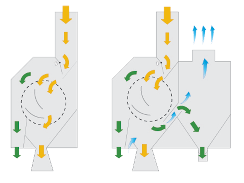 A weighted inlet flap distributes the product perfectly over the entire working surface even in the case of fluctuating throughput rates and product changes. The product flows through a rotating screen drum where coarse rejects are separated and discharged on the periphery of the screen drum.