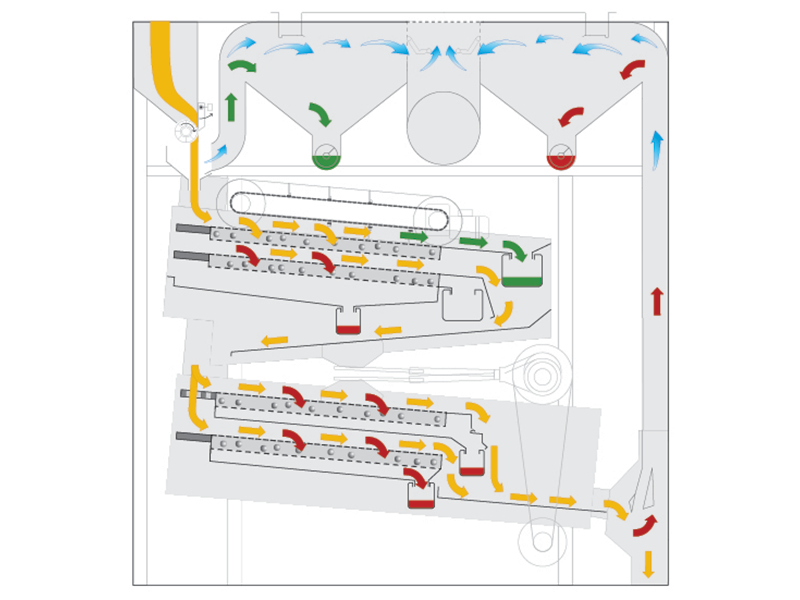 The U-cleaner is equipped with an inlet hopper, one pre-air separator and one final air separator with deposit chamber, as well as two screen compartments oscillating in opposite directions each with two screen layers. The different components are driven by gear motors. The product is moved from the inlet hopper into the pre-aspiration where light rejects, husk and dust are separated. Afterwards the product is transported into the top screen compartment with the two screen layers. The first screen layer is used for separating the coarse rejects and the second screen layer can either be used for separating coarse or light rejects depending on the desired mode of cleaning. The two screen layers in the bottom screen compartment can be used for separating coarse and light rejects or for calibrating the product by using the product diverters and chutes, depending on the mode of cleaning.